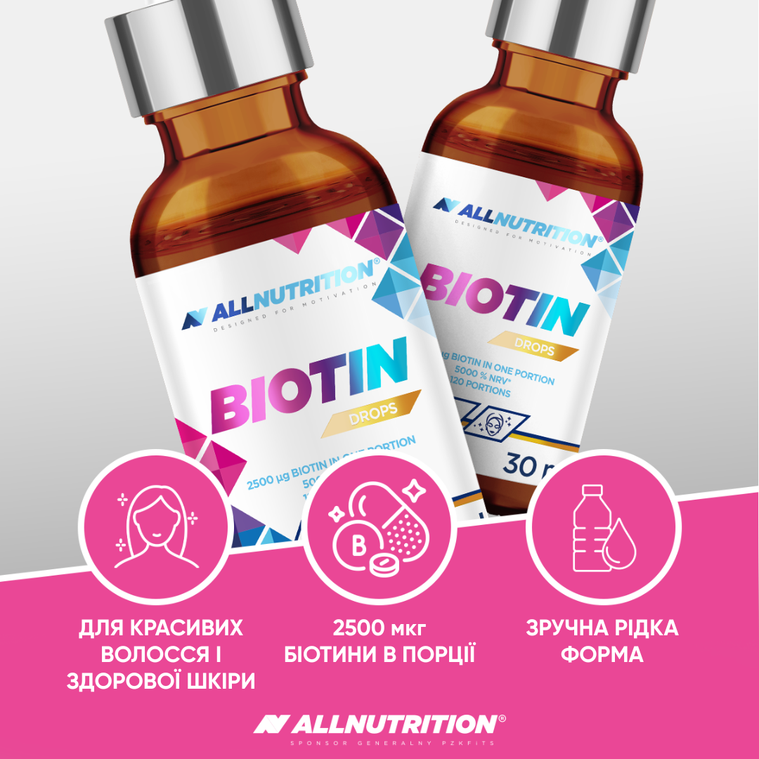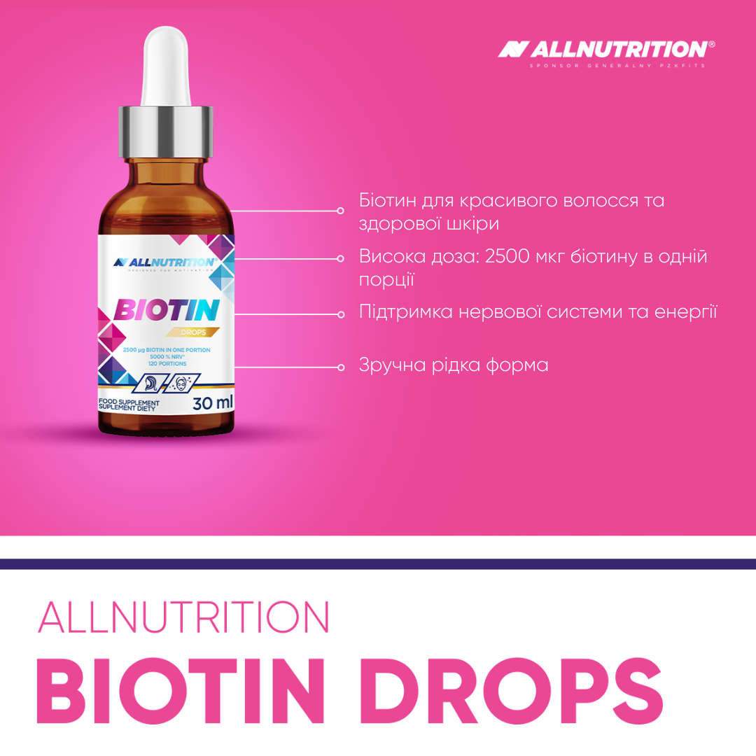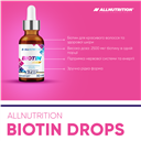ALLNUTRITION BIOTIN DROPS — це концентрована доза біотину у зручній формі крапель – аж 5000% від *Референтної добової споживчої порції (РДСп) в одній порції! В одній пляшечці 150 порцій — це 5 місяців комплексної підтримки шкіри, волосся та здоров’я, без необхідності ковтати капсули!