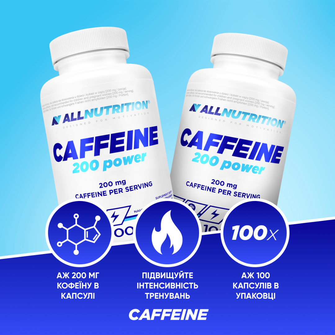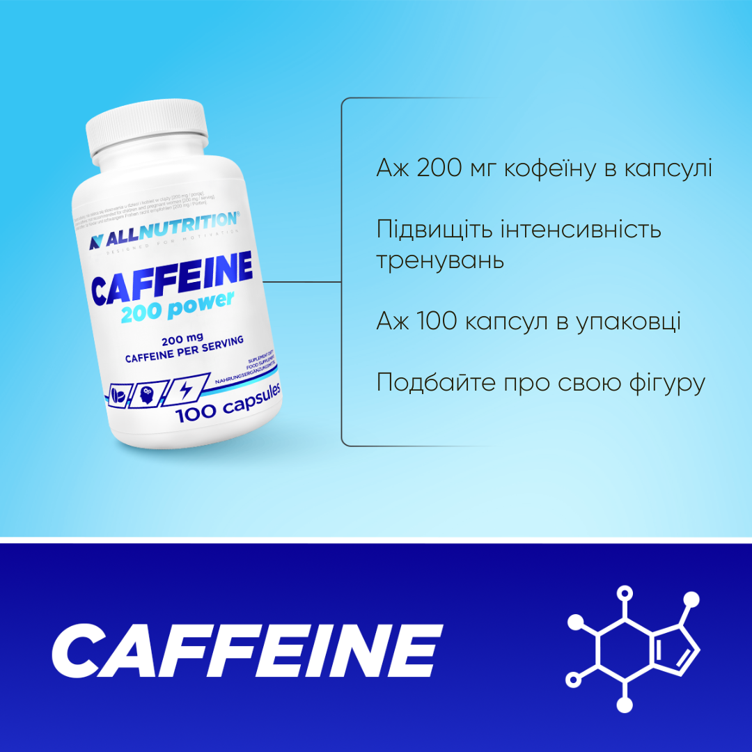 кофеїн безводний, мальтодекстрин, оболонка капсули (желатин), антизлежувачі: карбонат кальцію, діоксид кремнію, магнієві солі жирних кислот, може містити злаки, що містять глютен, соя, молоко, яйця та продукти з них