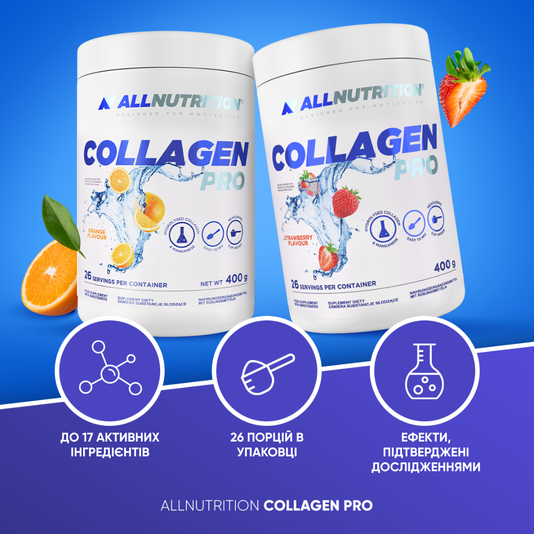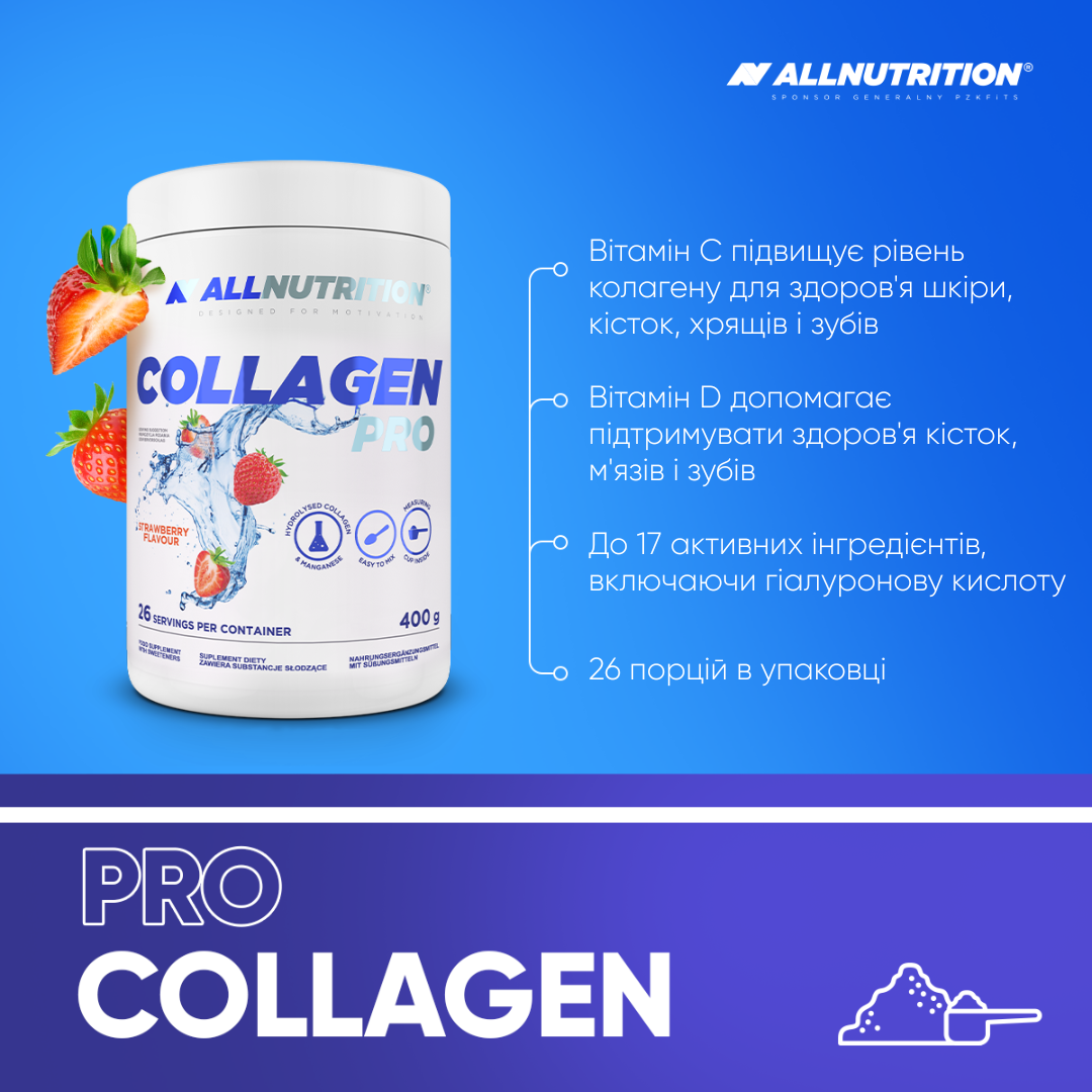 ALLNUTRITION COLLAGEN PRO дієтична добавка, що містить гідролізований колаген у зручній для пиття формі. Містить багато цінних і необхідних речовин. Завдяки вмісту вітамінів і мінералів підтримує здоров'я та опорно-руховий апарат.