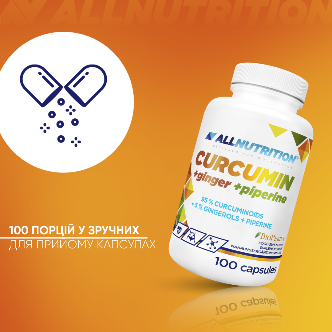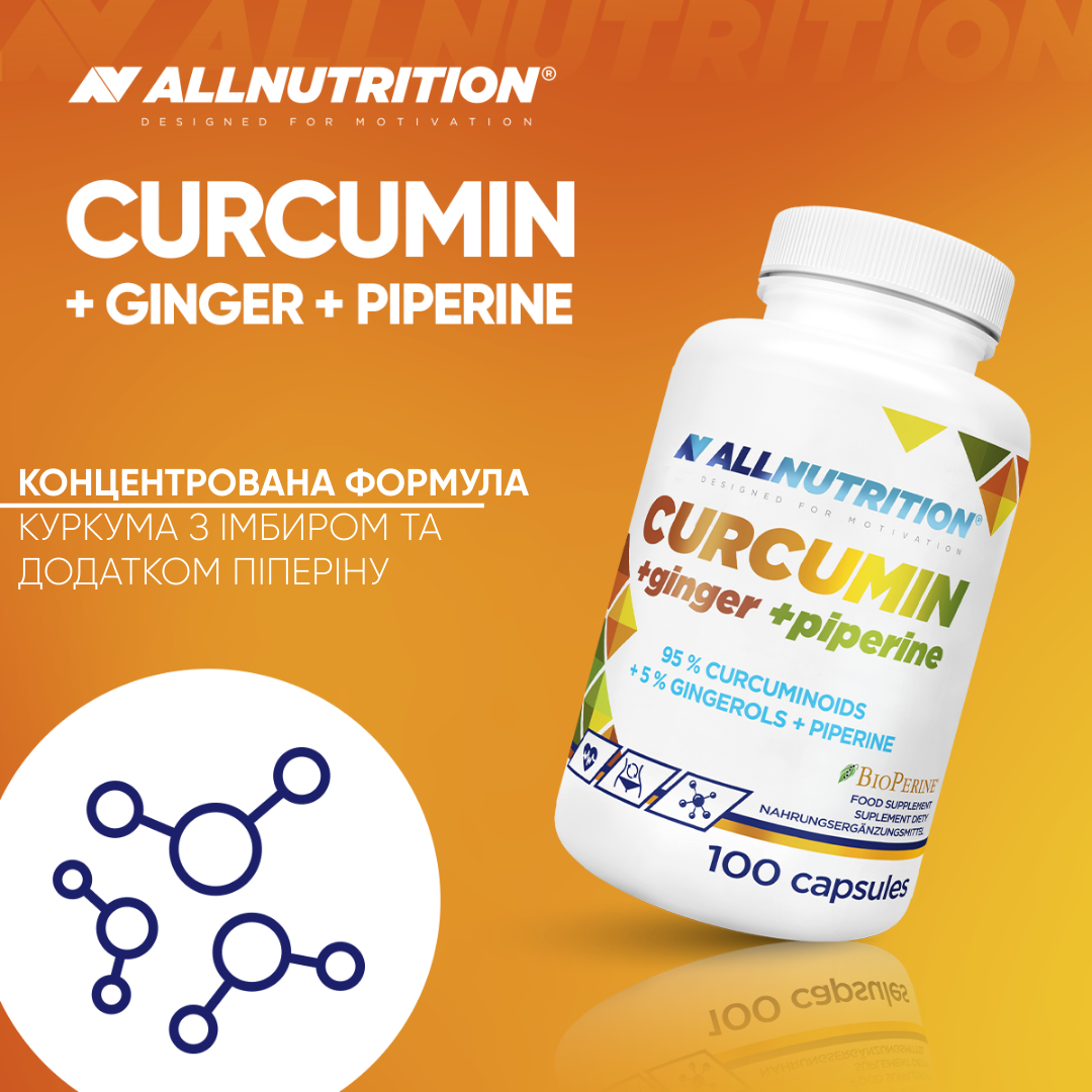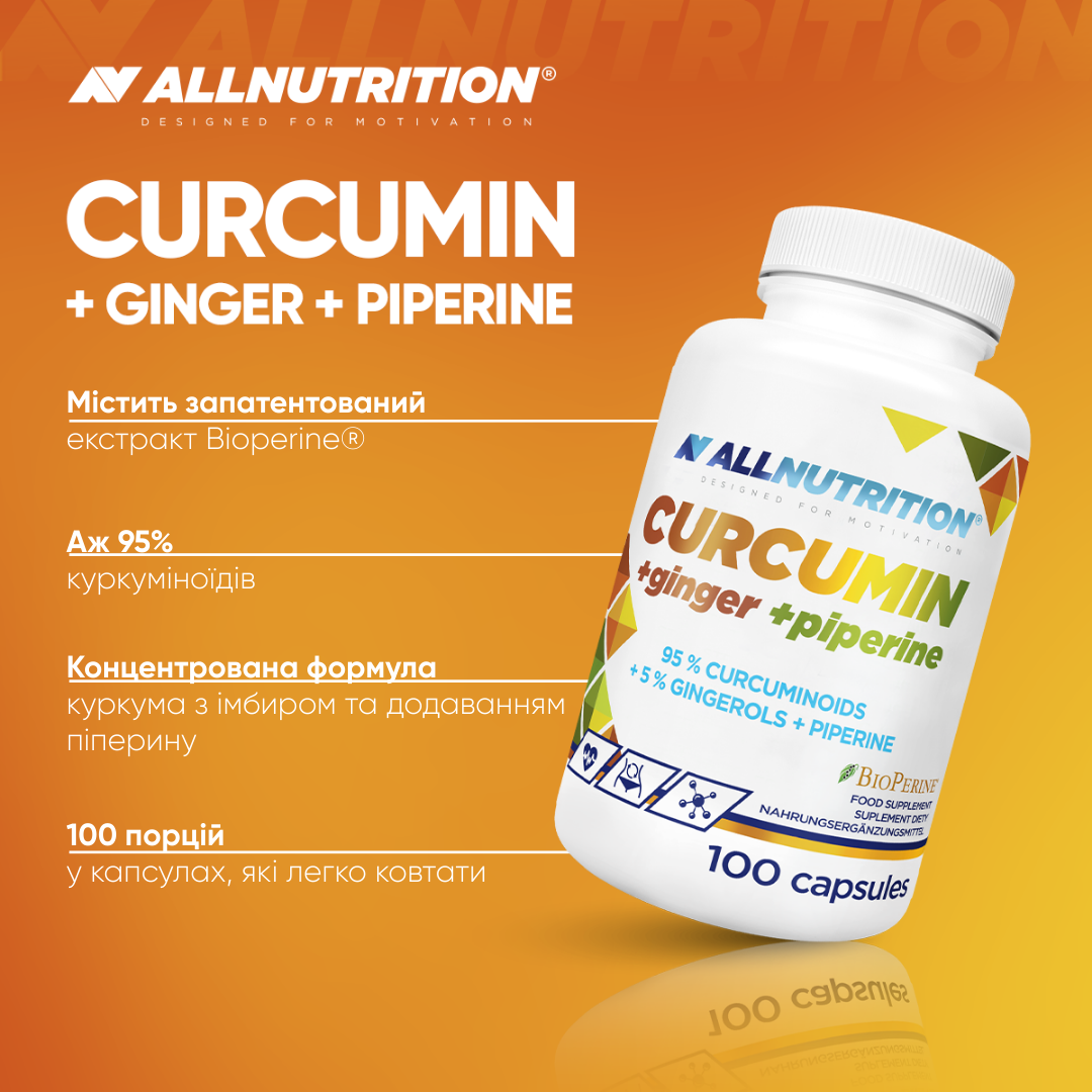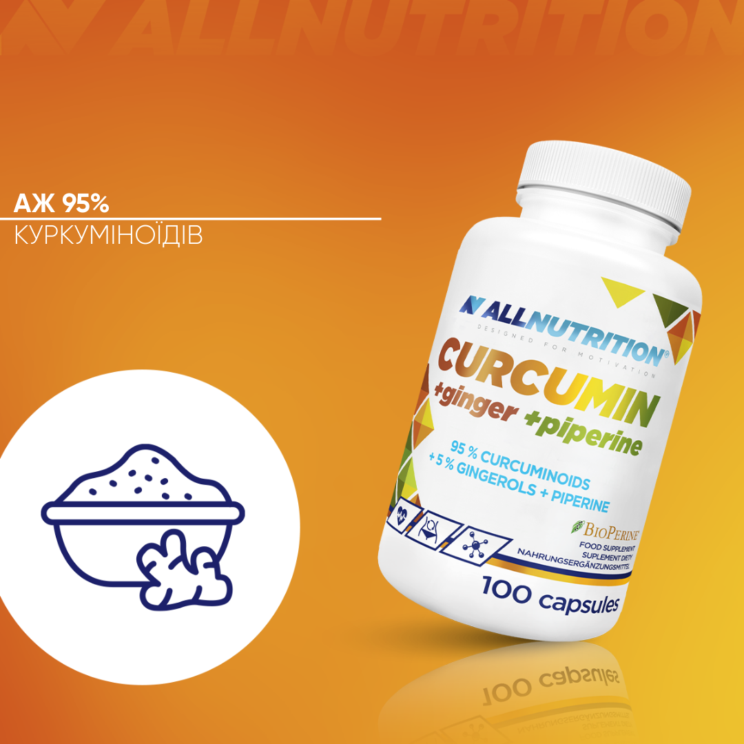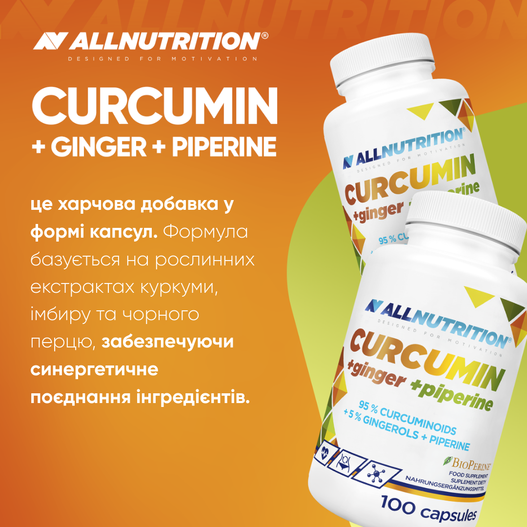 екстракт кореневища куркуми довгої curcuma longa, оболонка капсули (желатин), екстракт кореня імбиру zingiber officinale, крохмаль, bioperine® (біоперин) екстракт з плодів чорного перцю piper nigrum, антизлежувачі: діоксид кремнію, магнієві солі жирних кислот.