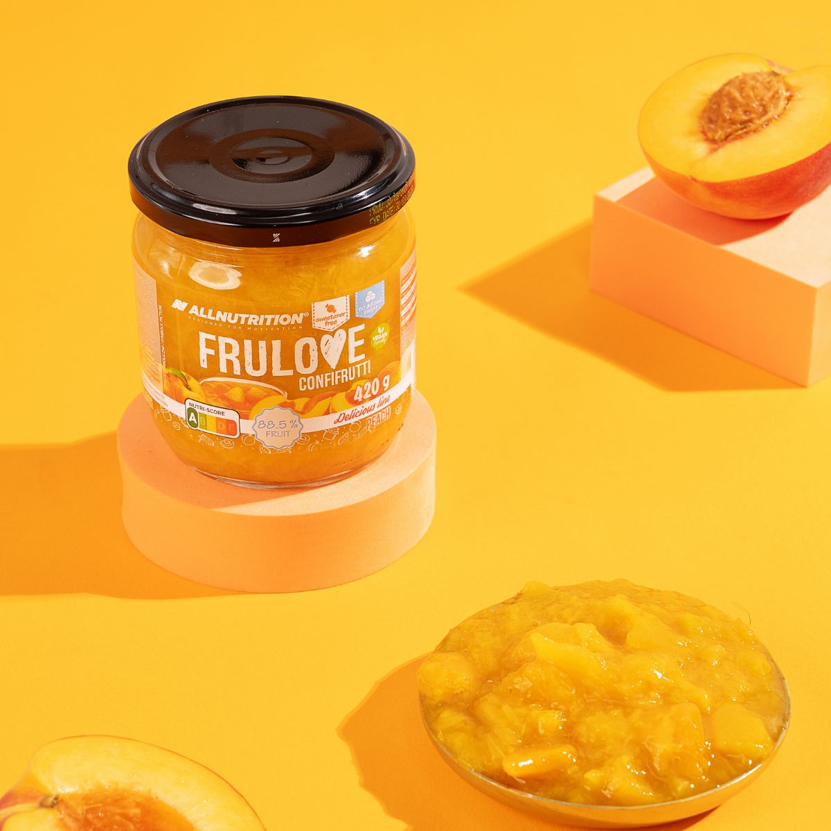 ALLNUTRITION FRULOVE CONFIFRUTTI PEACH — це справжня есенція фруктів, солодкість якої походить виключно з них самих. Це ідеальний вибір для тих, хто дбає про склад продуктів і смак! FRULOVE CONFIFRUTTI PEACH — смачне персикове доповнення до твоїх страв.
