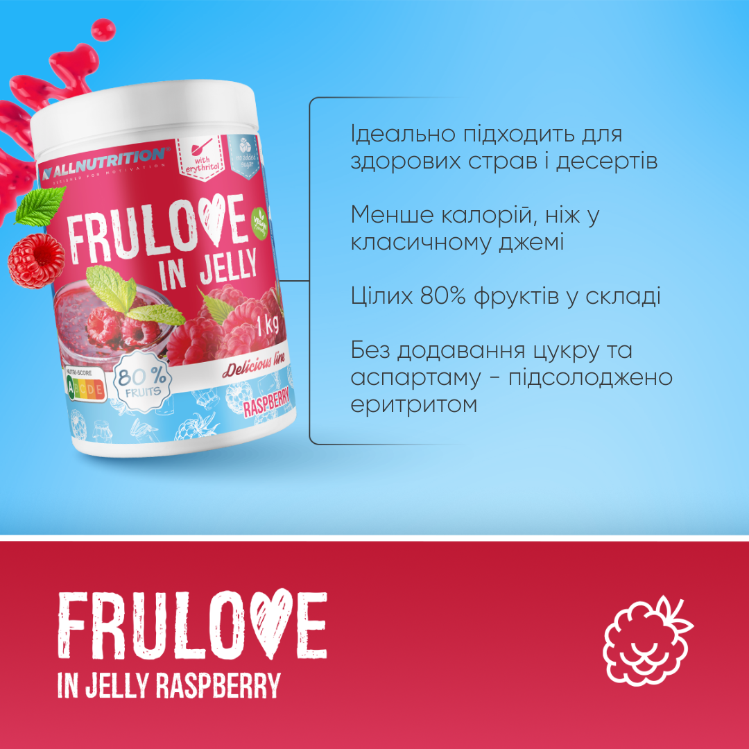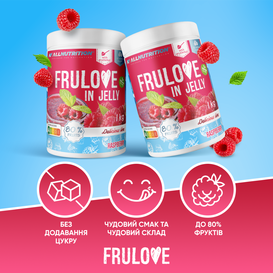 FRULOVE IN JELLY RASPBERRY — це ідеальний вибір для тих, хто хоче уникати штучних добавок у їжі та прагне зменшити кількість цукру у своєму раціоні.