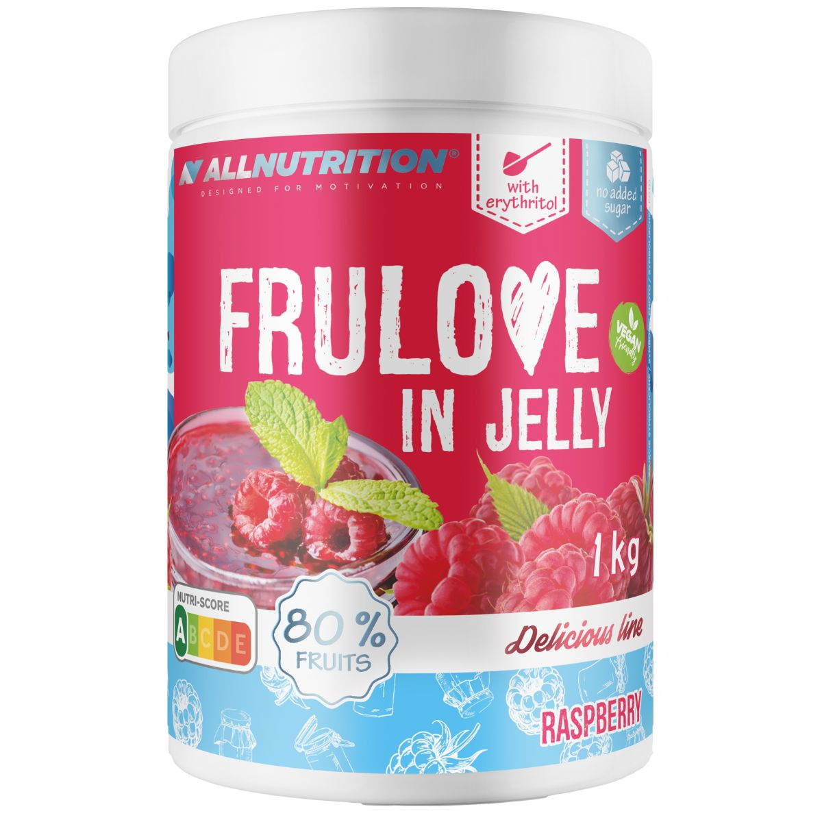 ALLNUTRITION FRULOVE IN JELLY RASPBERRY це смачний варення без додавання цукру з цілими шматочками малини, до 80% вмісту фруктів! Створений для всіх, хто хоче подбати про фігуру, не відмовляючись від невеликої солодкої насолоди в своєму раціоні.