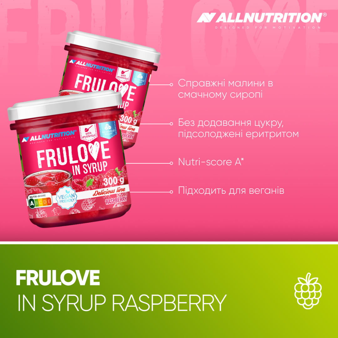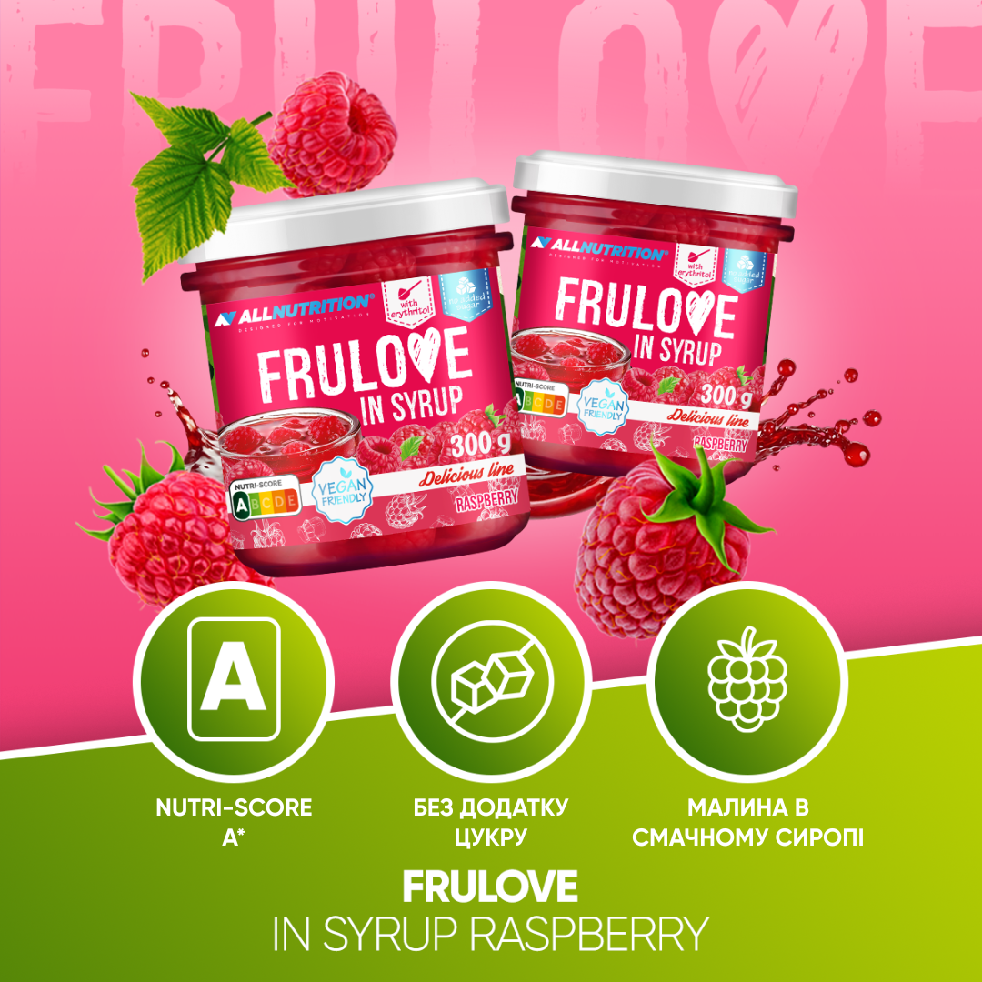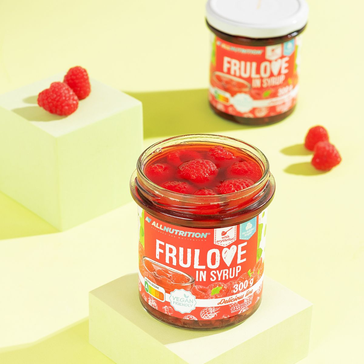 ALLNUTRITION FRULOVE IN SYRUP - це смачна малина, занурена у ніжний, солодкий сироп, який зачарує вас своєю легкістю та насиченим фруктовим смаком. Без доданого цукру та підсолоджений еритритом — ідеальний вибір для тих, хто дбає про свою фігуру, але не хоче відмовлятися від солодкої фруктової насолоди.