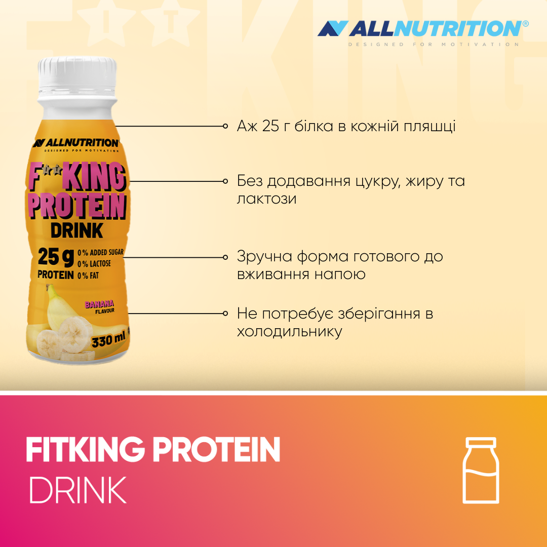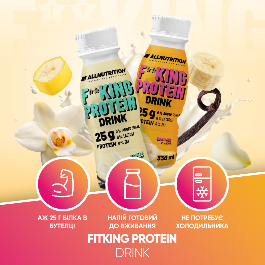 ALLNUTRITION FITKING PROTEIN DRINK — це смачний, високобілковий молочний напій, доступний у двох неперевершених смаках – ванільному та банановому. Кожна пляшка містить до 25 г білка та не містить доданого цукру, лактози чи жиру. Це зручний варіант для всіх, хто хоче збагатити свій раціон цінними поживними речовинами — незалежно від розкладу дня. Ідеально підходить для роботи, у дорозі, після тренування або коли потрібно щось швидке та поживне.
