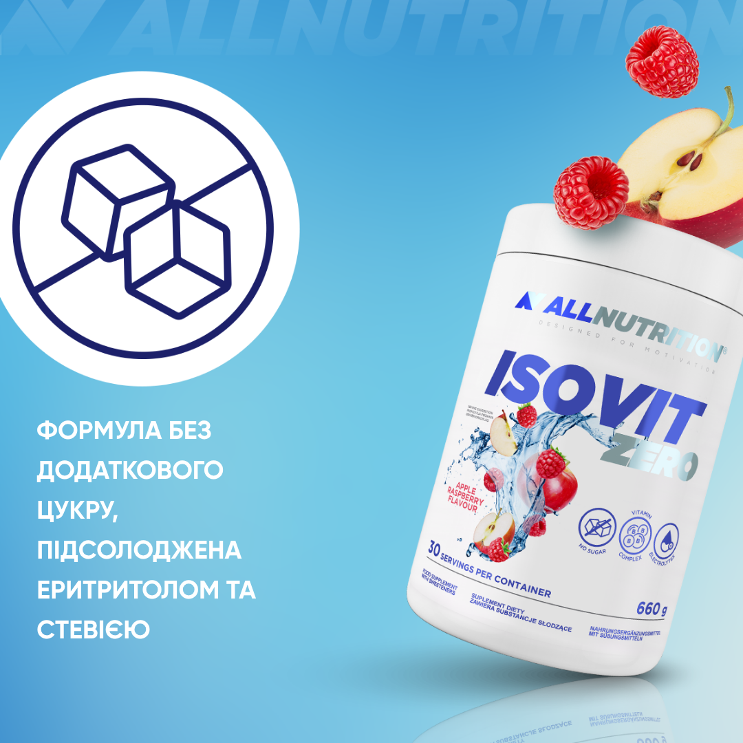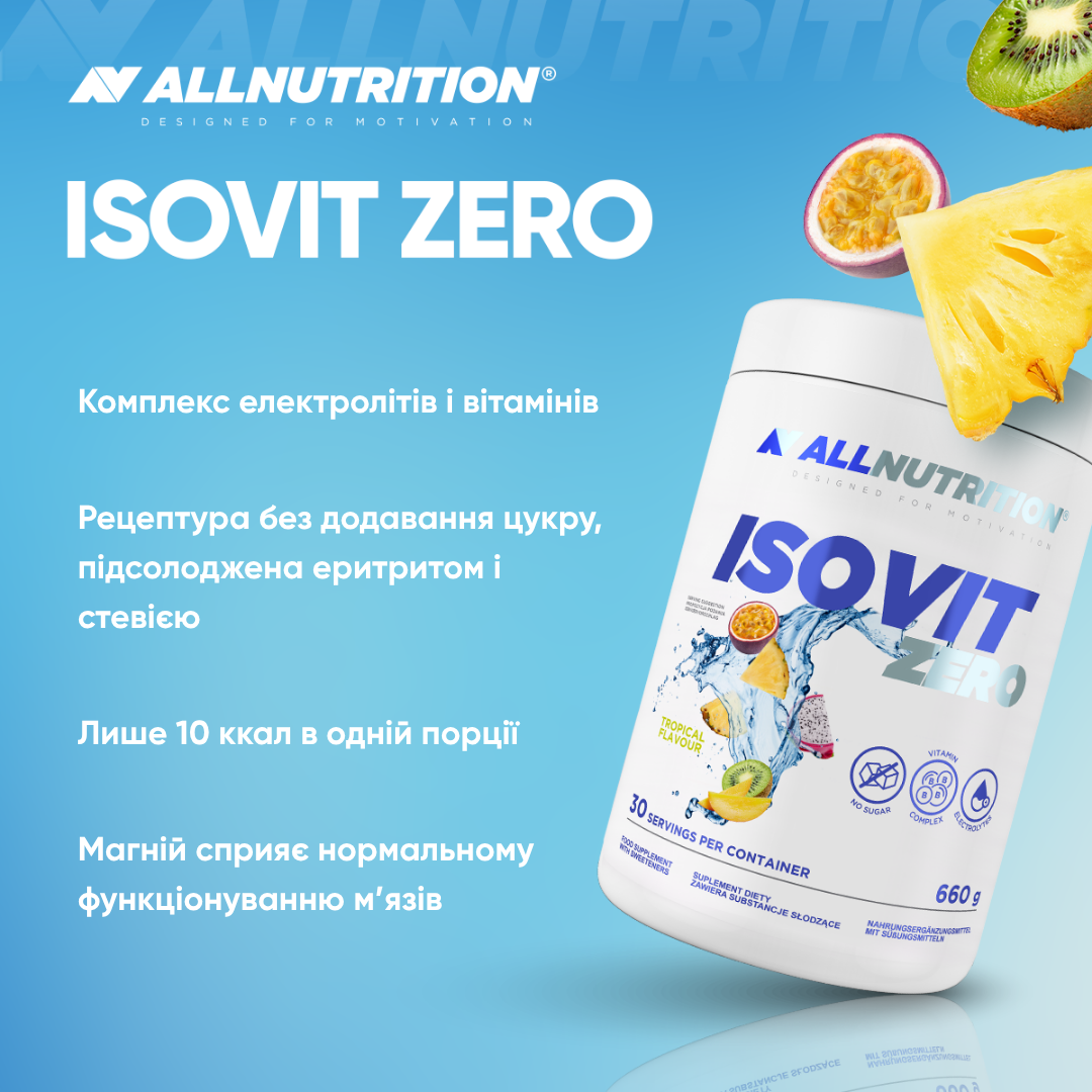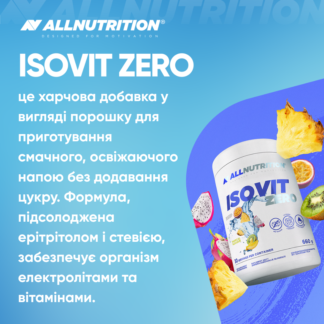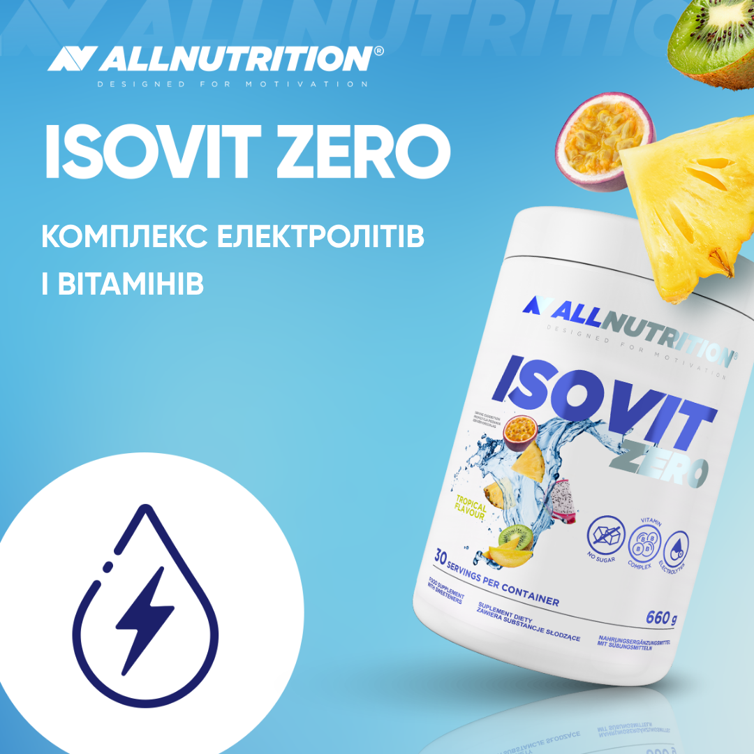 ALLNUTRITION ISOVIT ZERO — це харчова добавка у формі порошку для приготування смачного, освіжаючого напою без доданого цукру. Формула, підсолоджена еритритолом і стевією, забезпечує організм електролітами та вітамінами. Продукт збагачений таурином і чудово підходить до, під час і після тренування, допомагаючи поповнити рідину та мінерали, втрачені з потом.