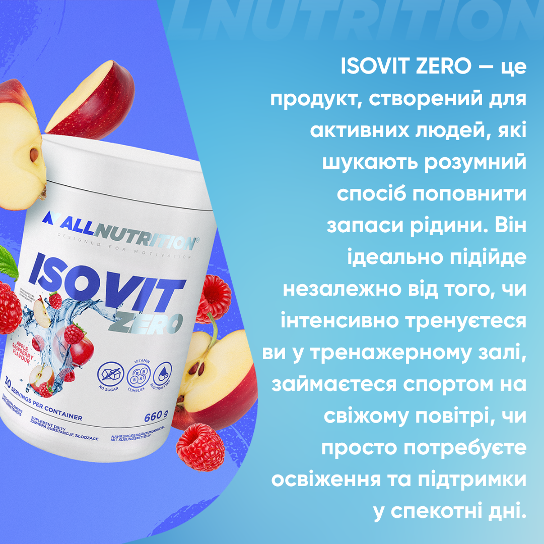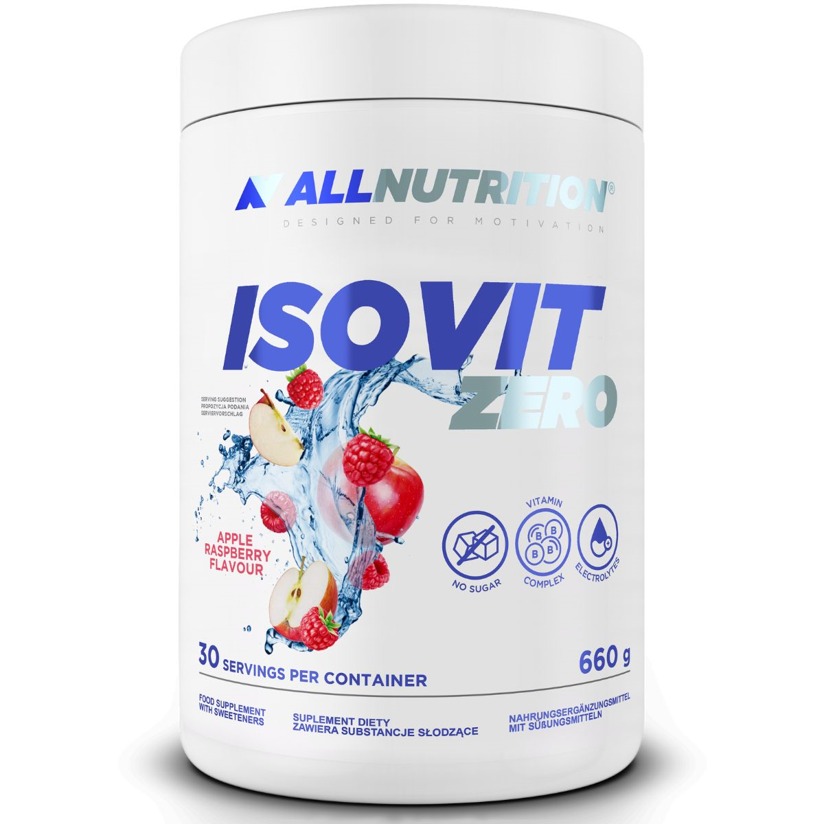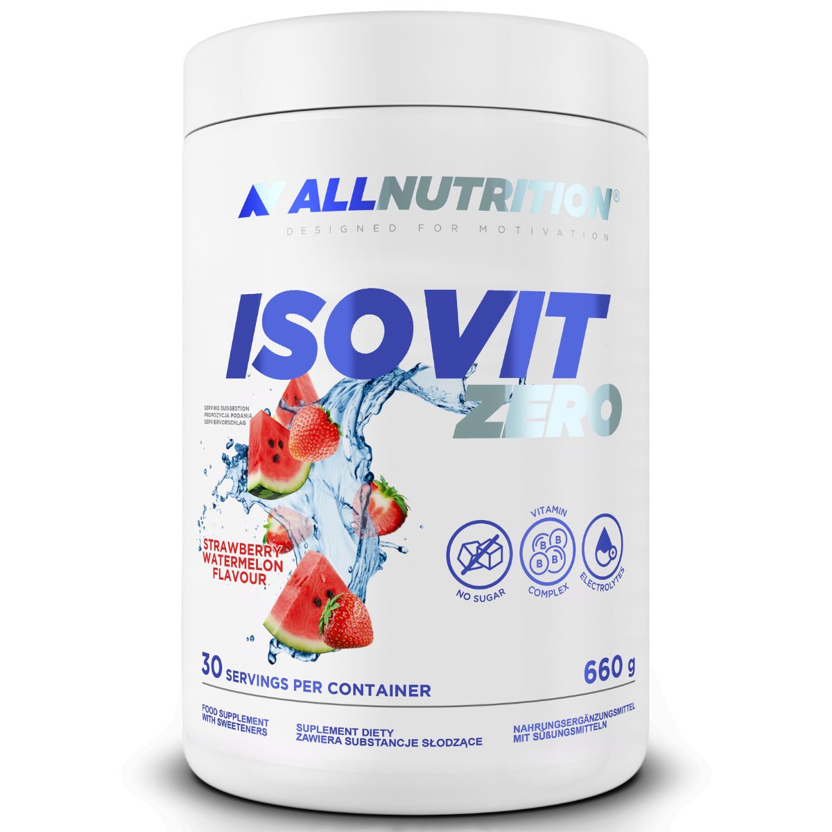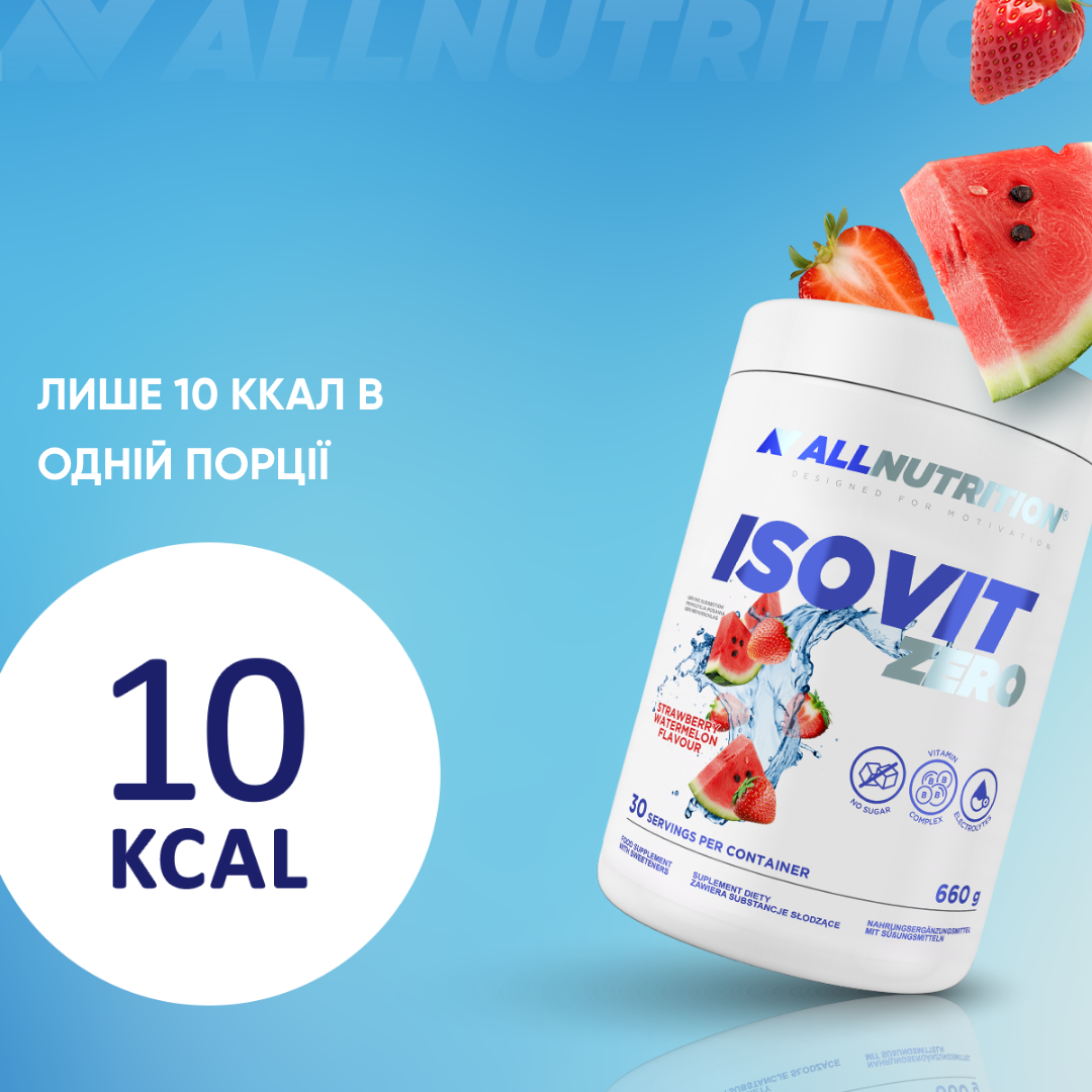 ALLNUTRITION ISOVIT ZERO — це харчова добавка у формі порошку для приготування смачного, освіжаючого напою без доданого цукру. Формула, підсолоджена еритритолом і стевією, забезпечує організм електролітами та вітамінами. Продукт збагачений таурином і чудово підходить до, під час і після тренування, допомагаючи поповнити рідину та мінерали, втрачені з потом.