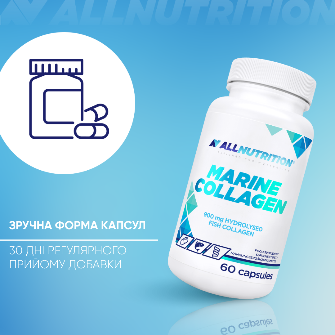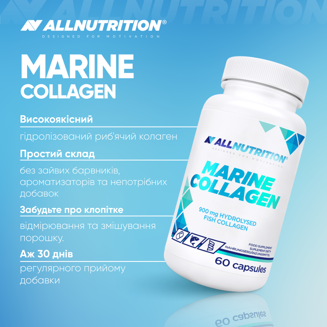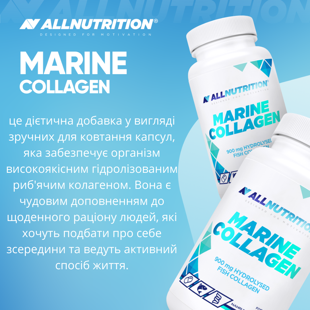 ALLNUTRITION MARINE COLLAGEN — це дієтична добавка у формі зручних для ковтання капсул, що забезпечує високоякісний гідролізований морський колаген. Це чудове доповнення до щоденного раціону для людей, які хочуть піклуватися про себе зсередини та ведуть активний спосіб життя. Якщо ви шукаєте ефективну підтримку для свого організму, цей продукт — ідеальний вибір! Насолоджуйтесь простою добавкою без зайвих компонентів.