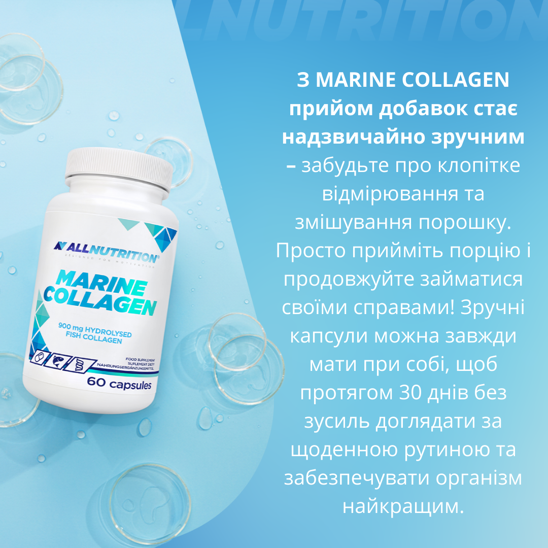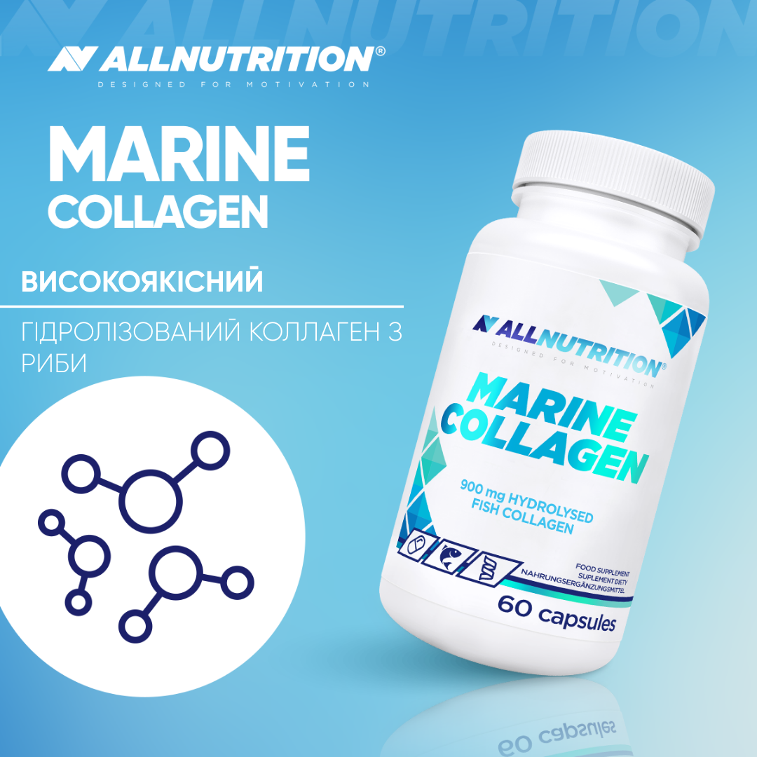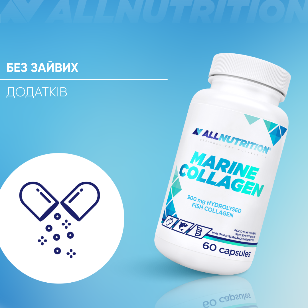ALLNUTRITION MARINE COLLAGEN — це дієтична добавка у формі зручних для ковтання капсул, що забезпечує високоякісний гідролізований морський колаген. Це чудове доповнення до щоденного раціону для людей, які хочуть піклуватися про себе зсередини та ведуть активний спосіб життя. Якщо ви шукаєте ефективну підтримку для свого організму, цей продукт — ідеальний вибір! Насолоджуйтесь простою добавкою без зайвих компонентів.