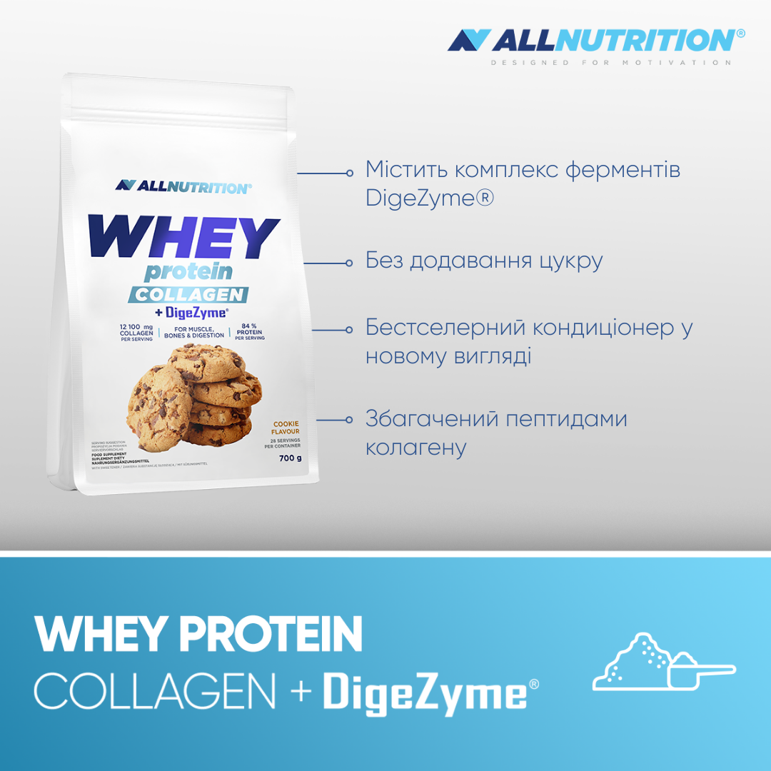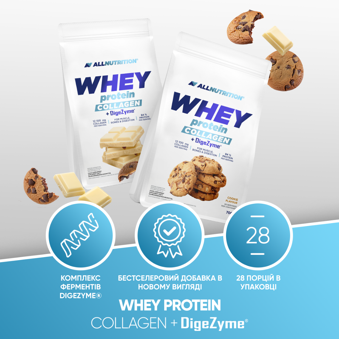 ALLNUTRITION WHEY PROTEIN COLLAGEN+DIGEZYME це бестселерний протеїновий коктейль WPC в новій версії - збагачений пептидами колагену яловичини та травними ферментами фірмової формули Digezyme®. Це не тільки відмінна підтримка для побудови сильних, більших м'язів, але й спосіб комплексного відновлення організму, здорових кісток та підтримки травної системи.