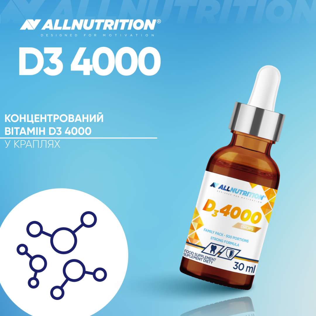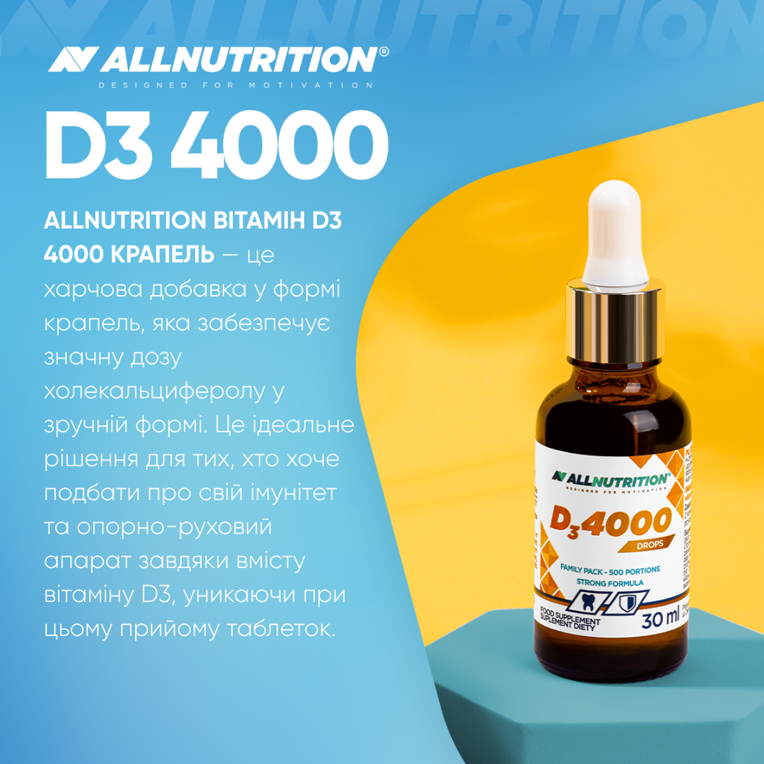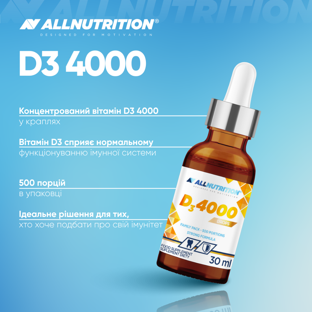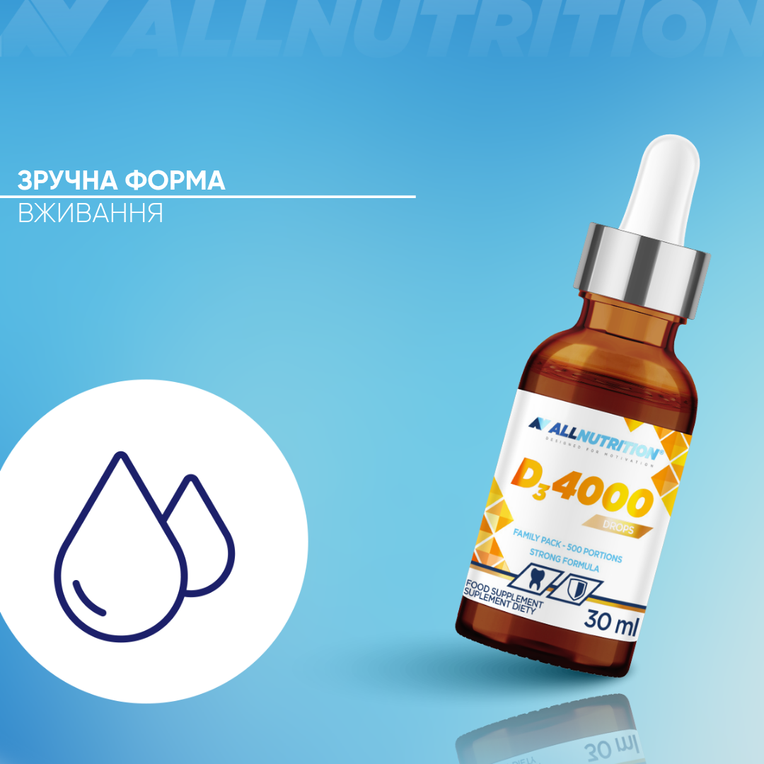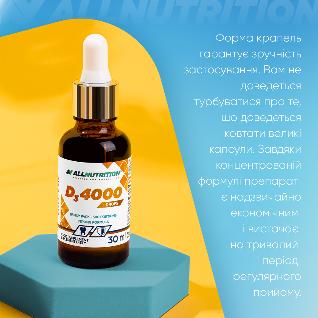 ALLNUTRITION ВІТАМІН D3 4000 DROPS — це дієтична добавка у формі крапель, яка забезпечує високу дозу холекальциферолу у зручній формі. Це ідеальне рішення для тих, хто хоче підтримати імунітет і опорно-рухову систему завдяки вмісту вітаміну D3, уникаючи ковтання таблеток. Одна упаковка забезпечує до 500 порцій підтримки для вашого організму!