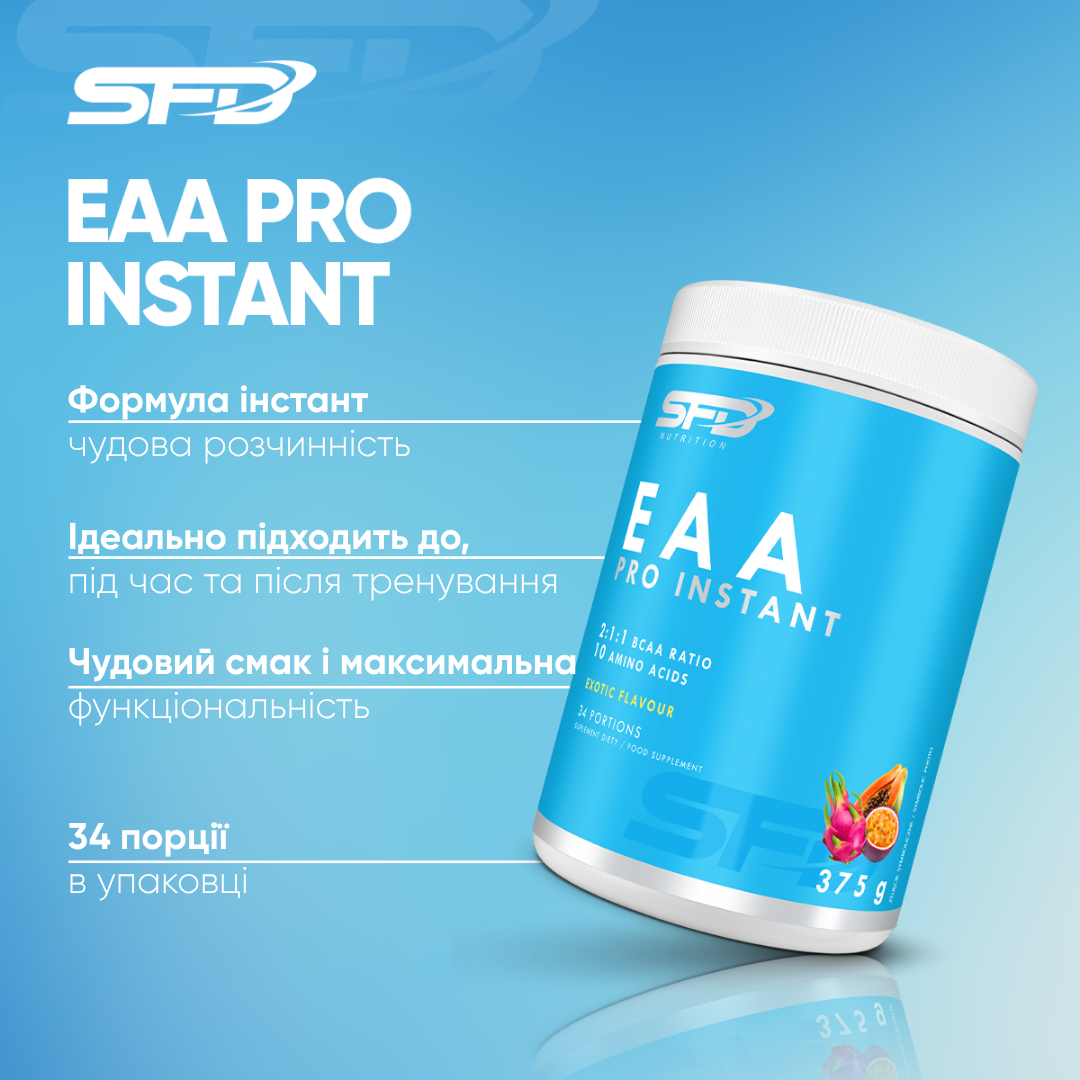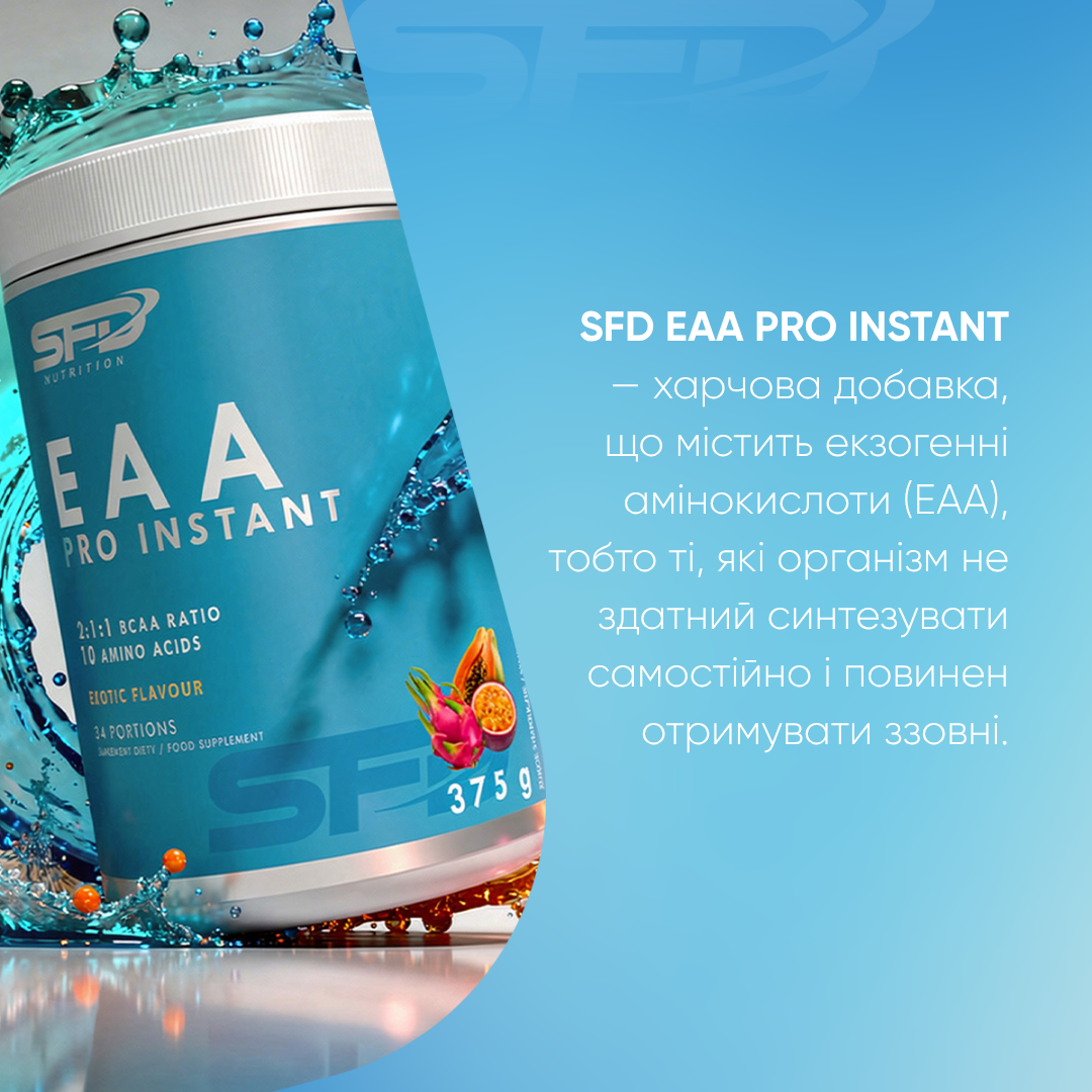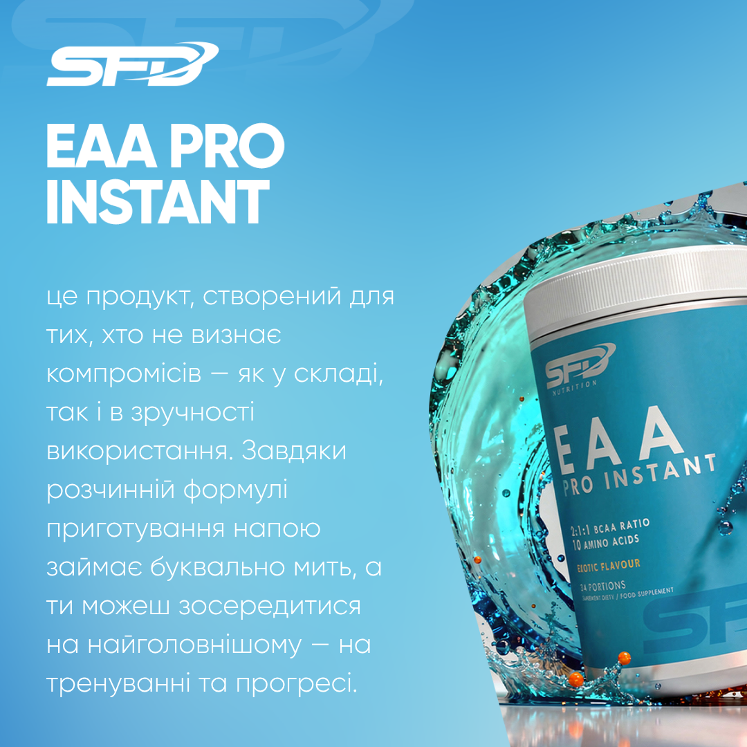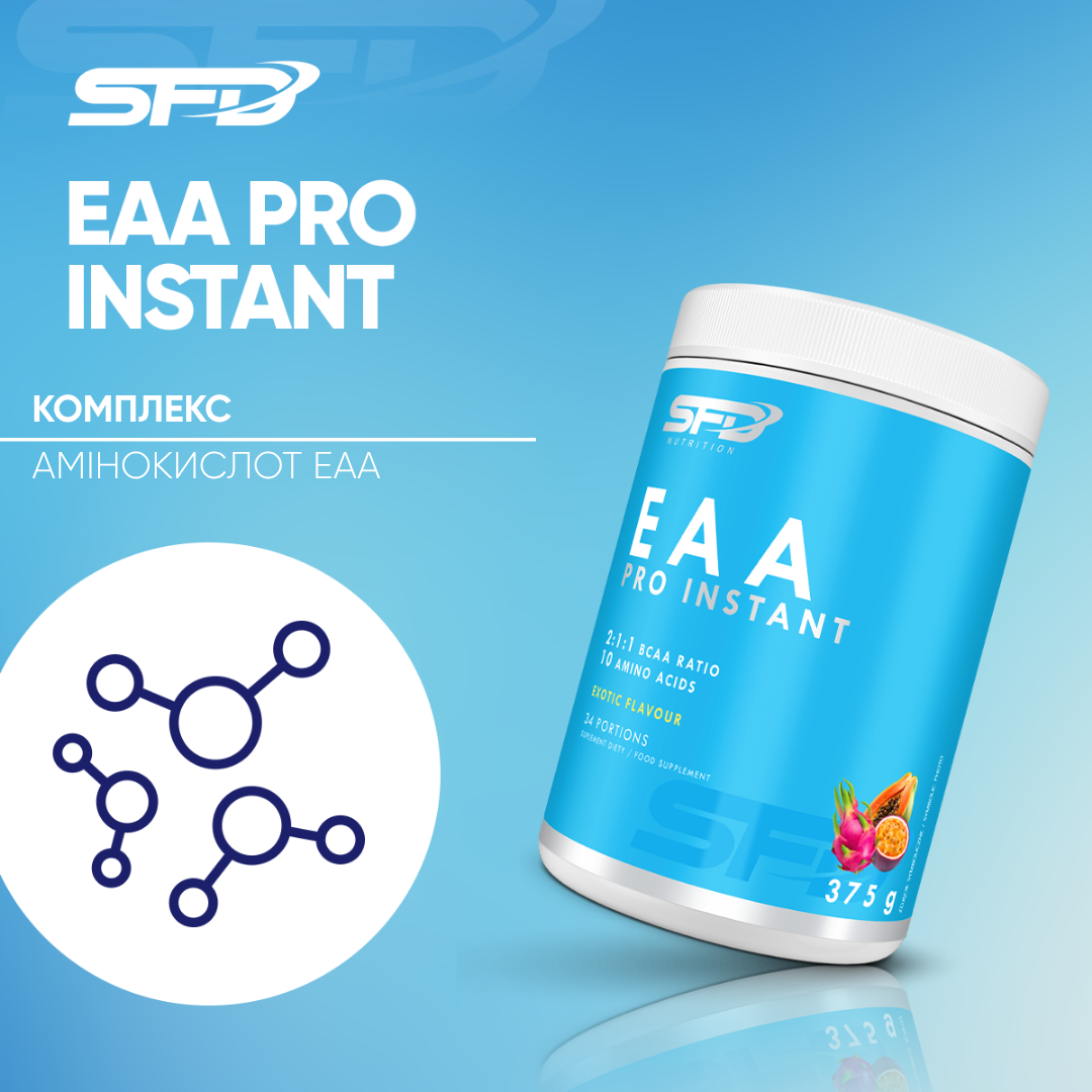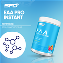 SFD EAA PRO INSTANT — це дієтична добавка, що містить незамінні амінокислоти (EAA), які організм не може синтезувати самостійно і повинен отримувати ззовні. У складі: гістидин, ізолейцин, лейцин, валін, лізин, метіонін, фенілаланін, треонін, триптофан, а також аргінін.
