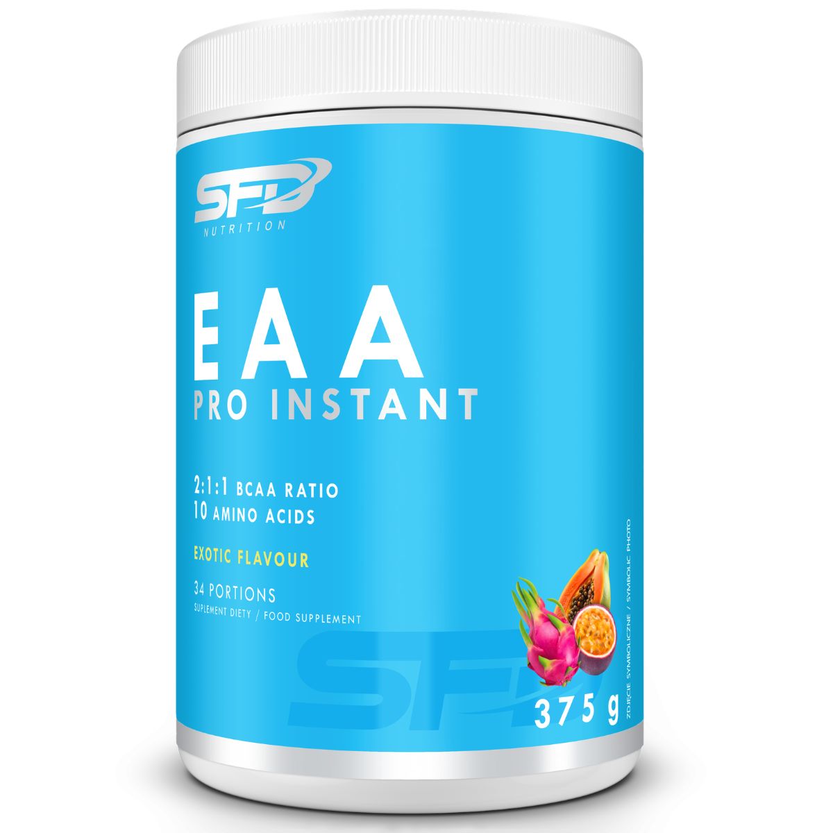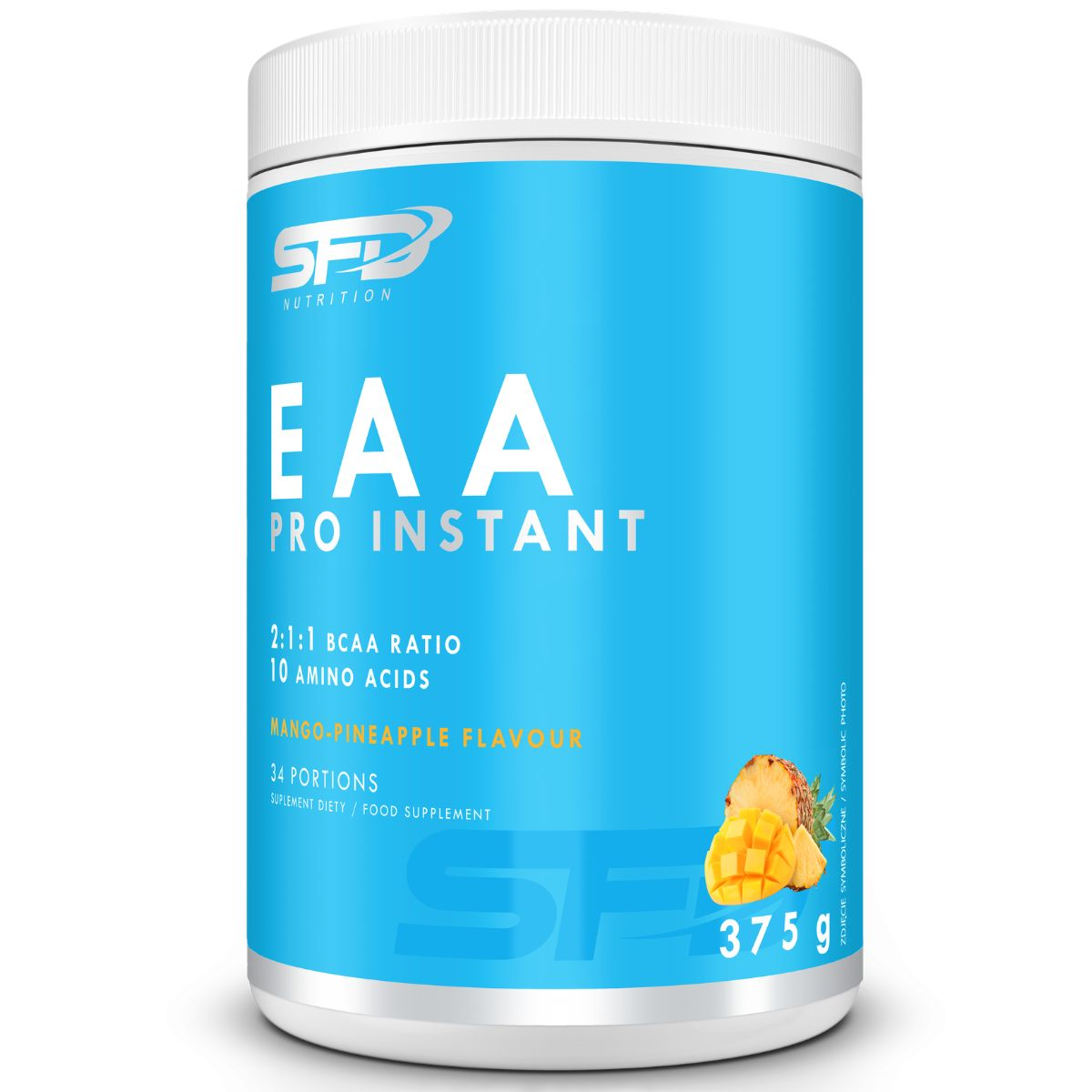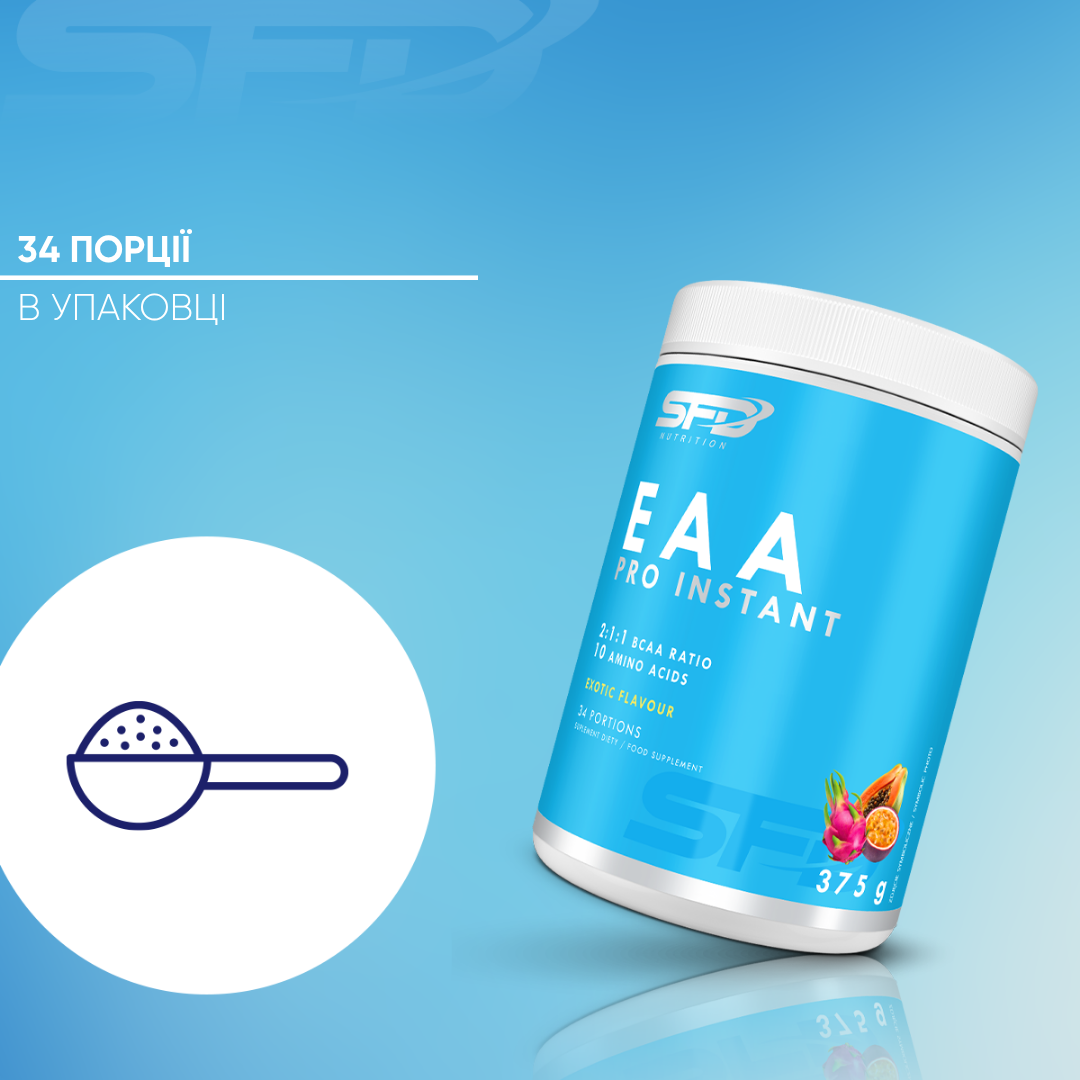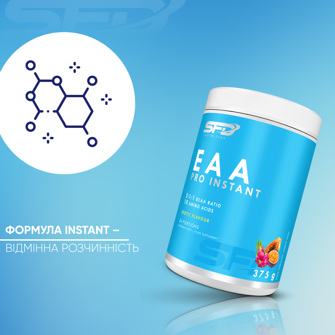 SFD EAA PRO INSTANT — це дієтична добавка, що містить незамінні амінокислоти (EAA), які організм не може синтезувати самостійно і повинен отримувати ззовні. У складі: гістидин, ізолейцин, лейцин, валін, лізин, метіонін, фенілаланін, треонін, триптофан, а також аргінін.