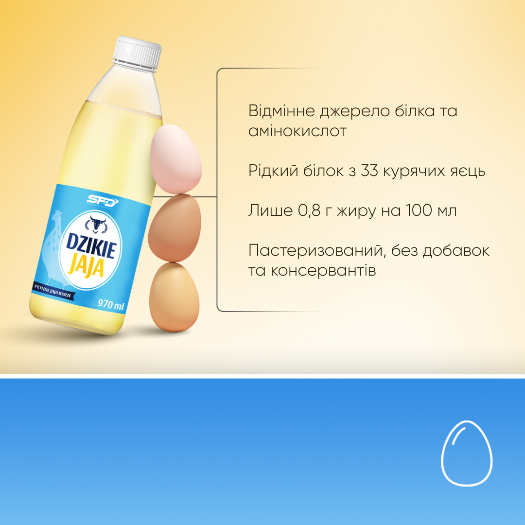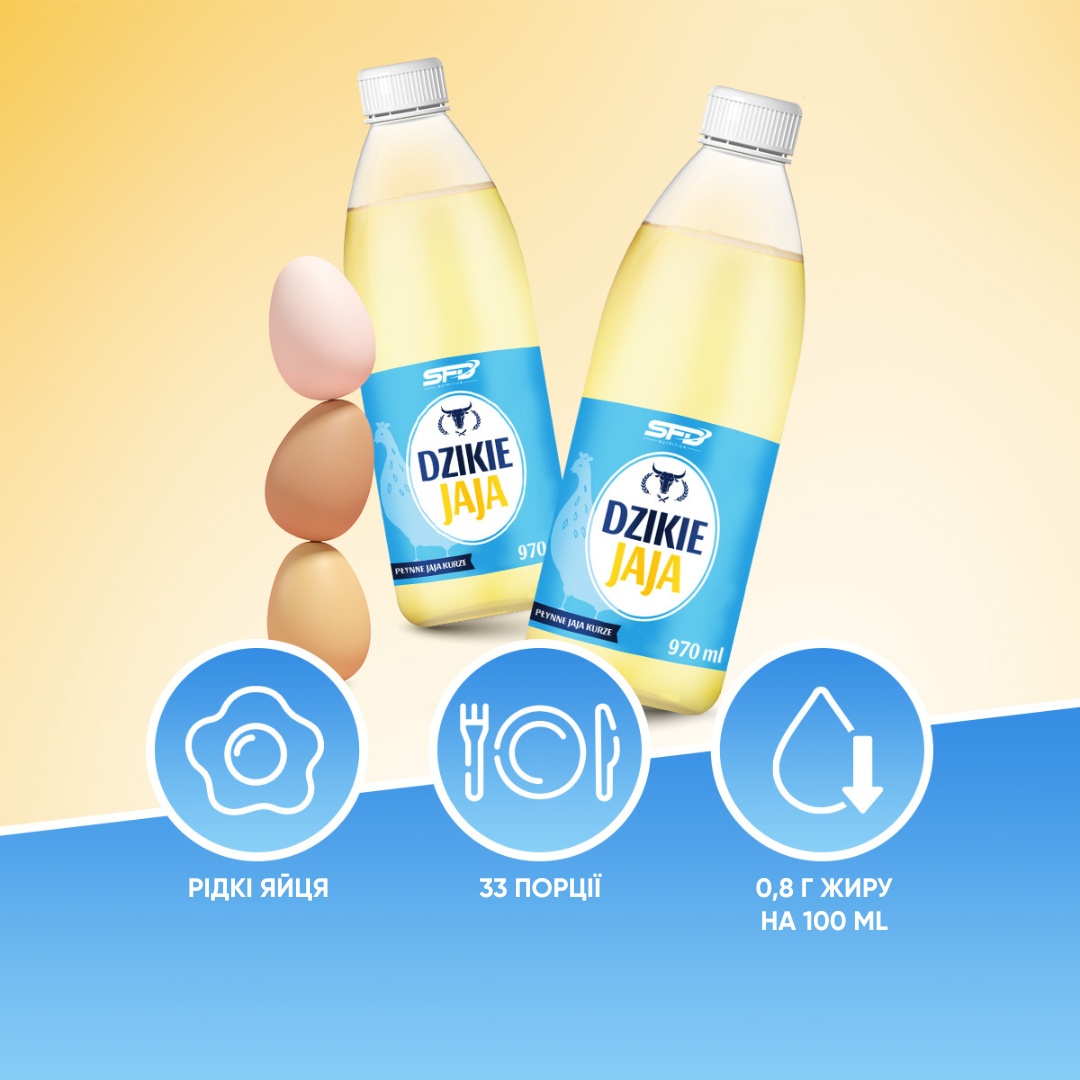 SFD ДИКІ ЯЙЦЯ — це зручний спосіб отримати високоякісний яєчний білок, включно з необхідними амінокислотами. Продукт створений для людей, які прагнуть збагатити свій раціон низькожировими джерелами білка та шукають практичні кулінарні рішення. Завдяки процесу пастеризації ДИКІ ЯЙЦЯ відрізняються підвищеною стійкістю та тривалішим терміном зберігання.
